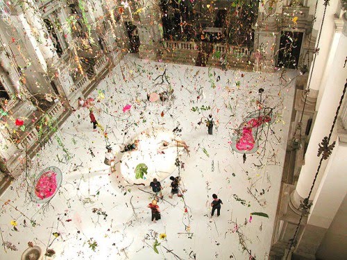 From the hands of Gerda Steiner and Jorg Lenzlinger, the Falling Garden installation was created for the 50th Venice Biennial Art Exhibition (in 2003). The artists collected items from around the world, among those- plastic berries, baobab seeds, thorns, cattail, plastic snakes, orange peels and celery roots.