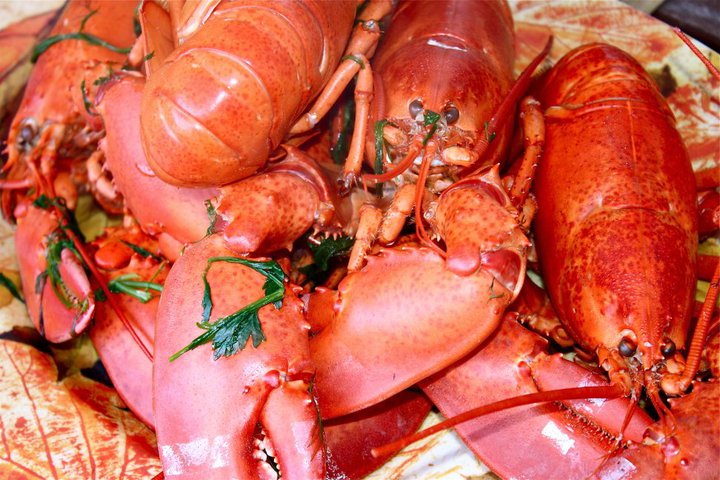 Live lobsters (boiled for 22 minutes w/ dill, lemon).